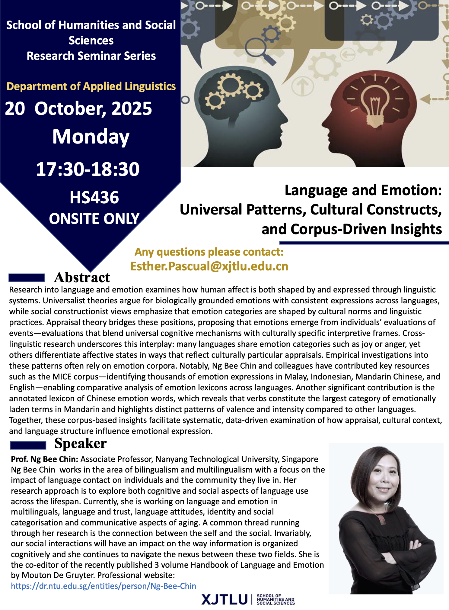 Research into language and emotion examines how human affect is both shaped by and expressed through linguistic systems. Universalist theories argue for biologically grounded emotions with consistent expressions across languages, while social constructionist views emphasize that emotion categories are shaped by cultural norms and linguistic practices. Appraisal theory bridges these positions, proposing that emotions emerge from individuals’ evaluations of events—evaluations that blend universal cognitive mechanisms with culturally specific interpretive frames. Cross linguistic research underscores this interplay: many languages share emotion categories such as joy or anger, yet others differentiate affective states in ways that reflect culturally particular appraisals. Empirical investigations into these patterns often rely on emotion corpora. Notably, Ng Bee Chin and colleagues have contributed key resources such as the MICE corpus—identifying thousands of emotion expressions in Malay, Indonesian, Mandarin Chinese, and English—enabling comparative analysis of emotion lexicons across languages. Another significant contribution is the annotated lexicon of Chinese emotion words, which reveals that verbs constitute the largest category of emotionally laden terms in Mandarin and highlights distinct patterns of valence and intensity compared to other languages. Together, these corpus-based insights facilitate systematic, data-driven examination of how appraisal, cultural context, and language structure influence emotional expression.
