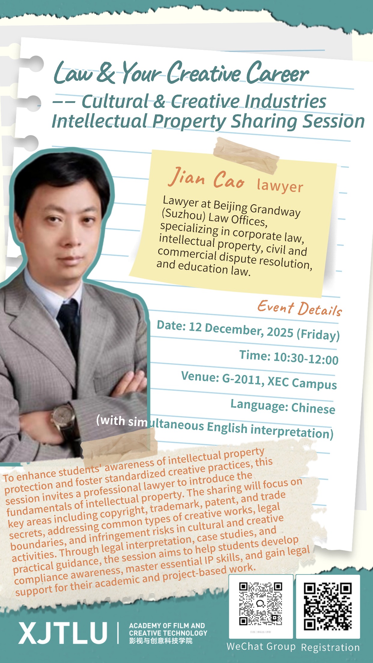 To enhance students' awareness of intellectual property protection and foster standardised creative practices, this session invites a professional lawyer to introduce the fundamentals of intellectual property. The sharing will focus on key areas, including copyright, trademark, patent, and trade secrets, addressing common types of creative works, legal boundaries, and infringement risks in cultural and creative activities. Through legal interpretation, case studies, and practical guidance, the session aims to help students develop compliance awareness, master essential IP skills, and gain legal support for their academic and project-based work.