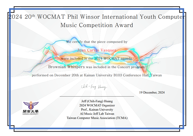The piece was awarded the 2024 20th WOCMAT Phil Winsor International Youth Computer Music Competition Award.
