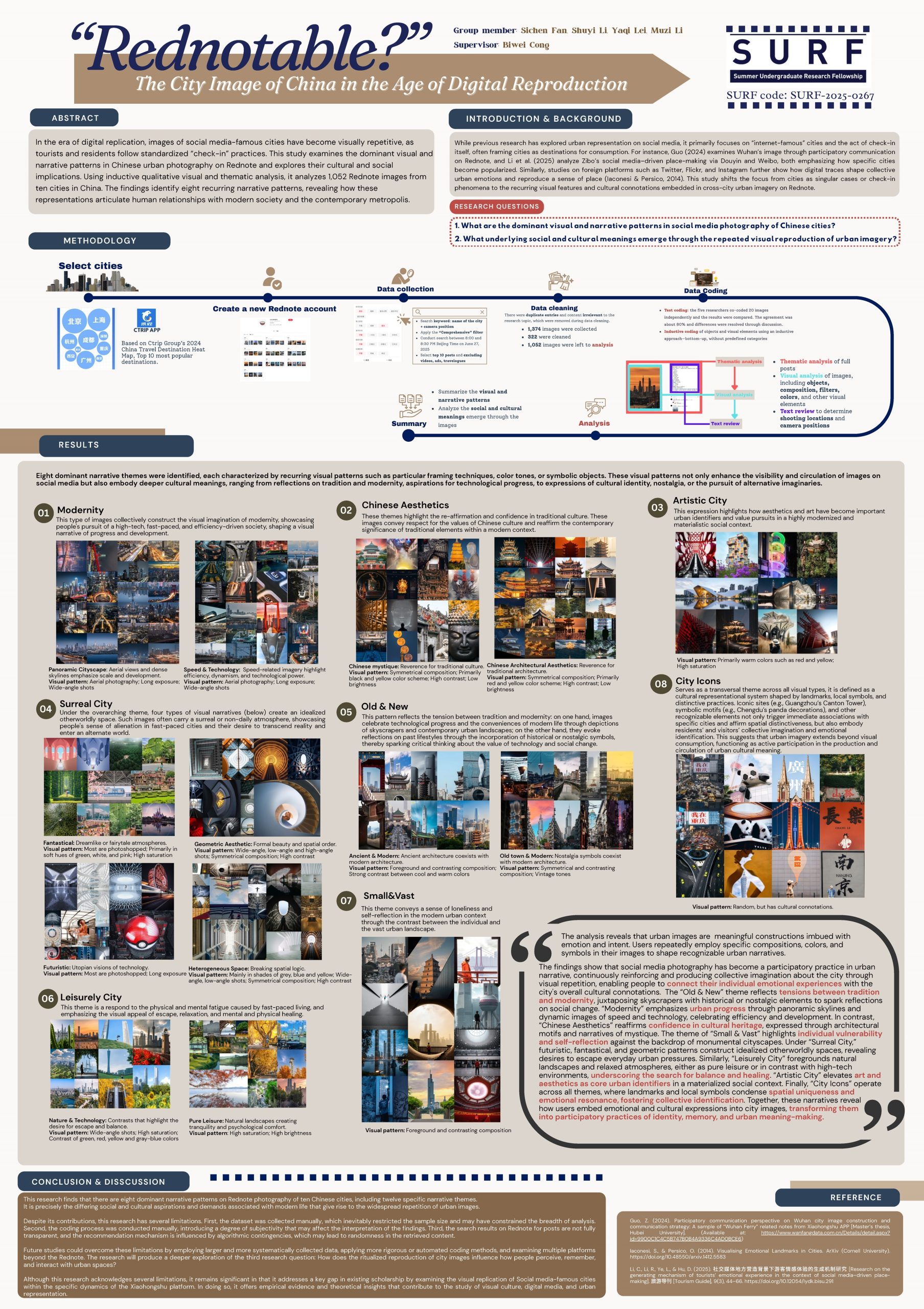 This project investigates how Chinese cities are visually represented in the era of digital reproduction. In the summer, Biwei led four students to conduct a systematic study of 1,052 Rednote images from ten major Chinese cities. Using a combination of visual analysis and thematic analysis, the team identified eight dominant visual and narrative patterns. These patterns not only reflect aesthetic preferences (composition, colour, filters) but also deeper cultural and social meanings. In doing so, the project contributes to wider discussions in visual culture, social media, and urban representation, showing how ritualised social-media photography practices both reflect and reshape collective understandings of the contemporary city.