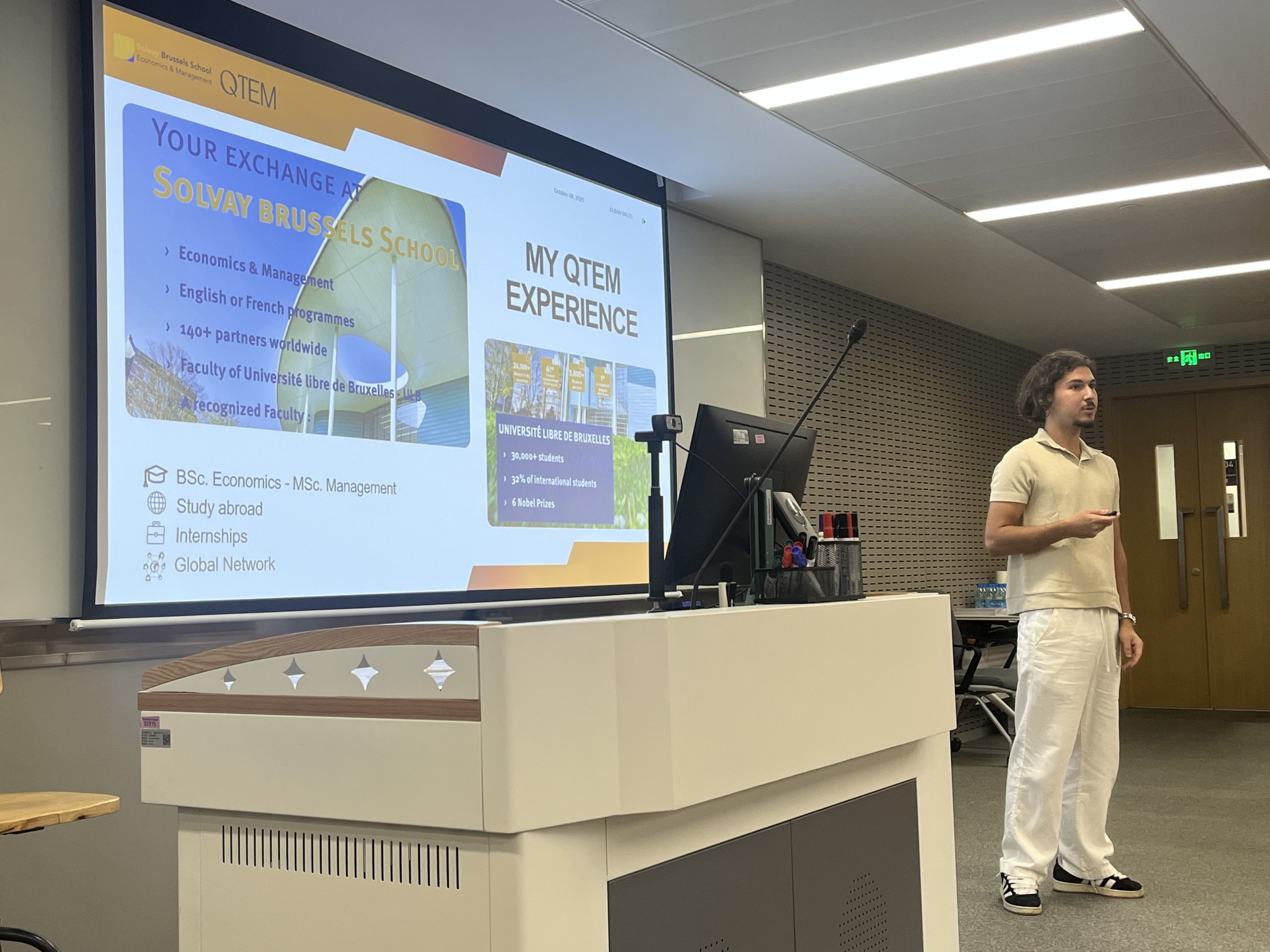 The session led by Professor Ewout van der Schaft, Associate Dean for Internationalisation at IBSS and Vice-Chair of the QTEM Board, alongside Dr Fan Liu, Director of QTEM at IBSS, and Ms Sihua Wang, IBSS QTEM Co-ordinator. They were joined by guest speakers Mr Alban Dauti, a current QTEM exchange student from Solvay Brussels School of Economics and Management, and Ms Yulia Yue Jiang, Head of School Relations for GMAC, Greater China.