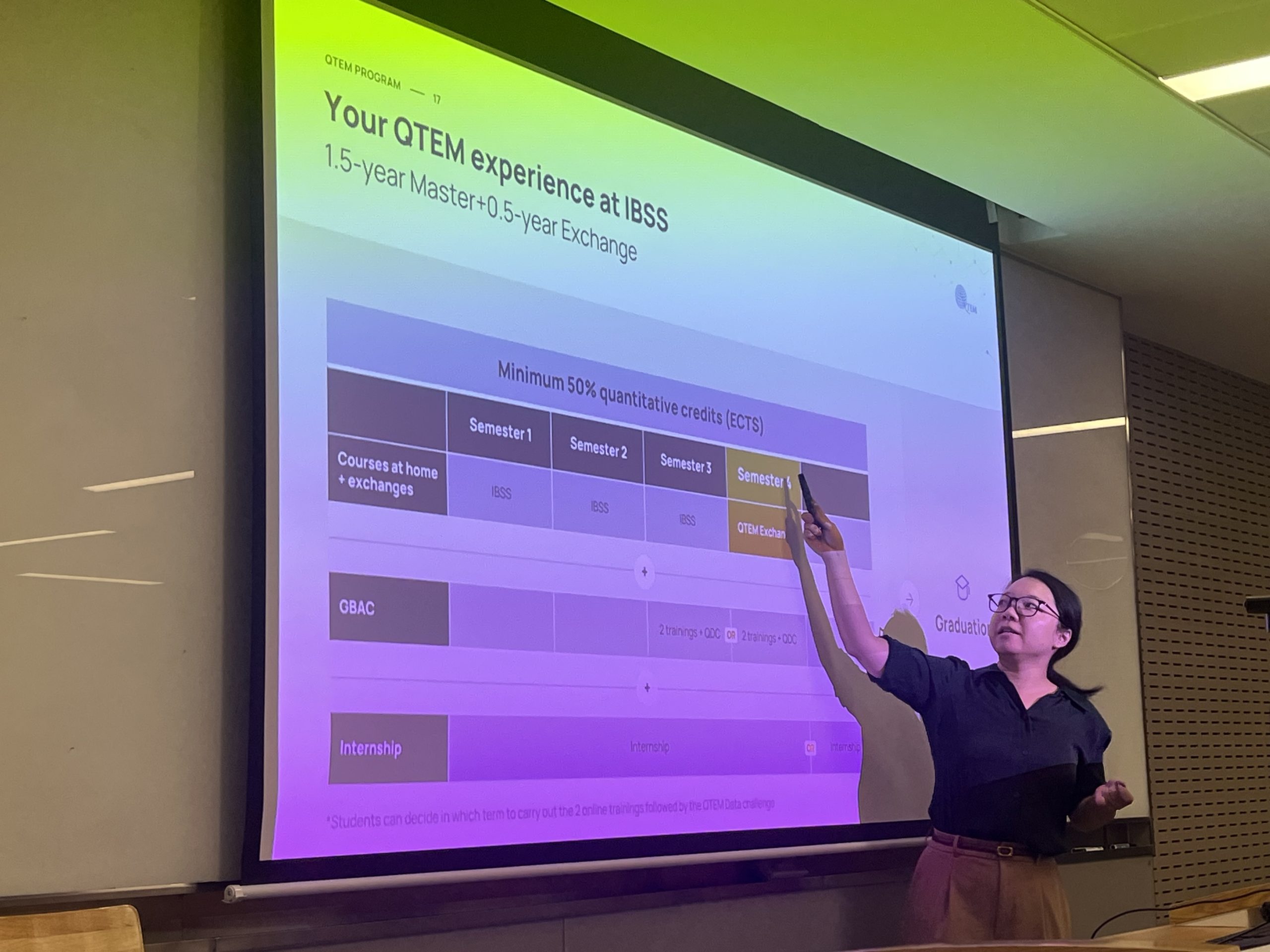 Dr Liu also outlined how students can join the QTEM network. All IBSS master’s programmes are eligible, with the top 20% of applicants directly invited to interview. Alternatively, students can qualify by achieving a GMAT score of 605 or above. Those scoring between 555 and 605 may still be considered if they can demonstrate strong academic results, English ability, quantitative experience, or evidence of international and professional engagement.