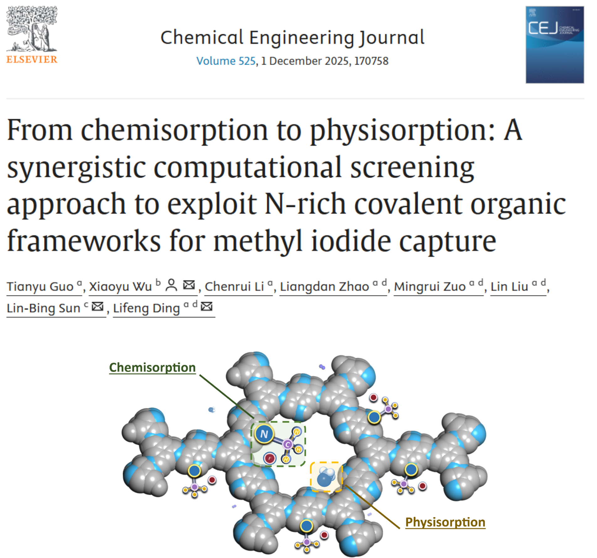 Recently, Tianyu Guo, a 2025 bachelor’s graduate from the Department of Chemistry and Materials Science, School of Science, at Xi’an Jiaotong-Liverpool University (XJTLU), has published groundbreaking research as first author in the prestigious international journal Chemical Engineering Journal (Impact Factor: 13.2). The paper, titled “From Chemisorption to Physisorption: A Synergistic Computational Screening Approach to Exploit N-Rich Covalent Organic Frameworks for Methyl Iodide Capture,” was co-authored with Associate Professor Lifeng Ding, who serves as the corresponding author.
