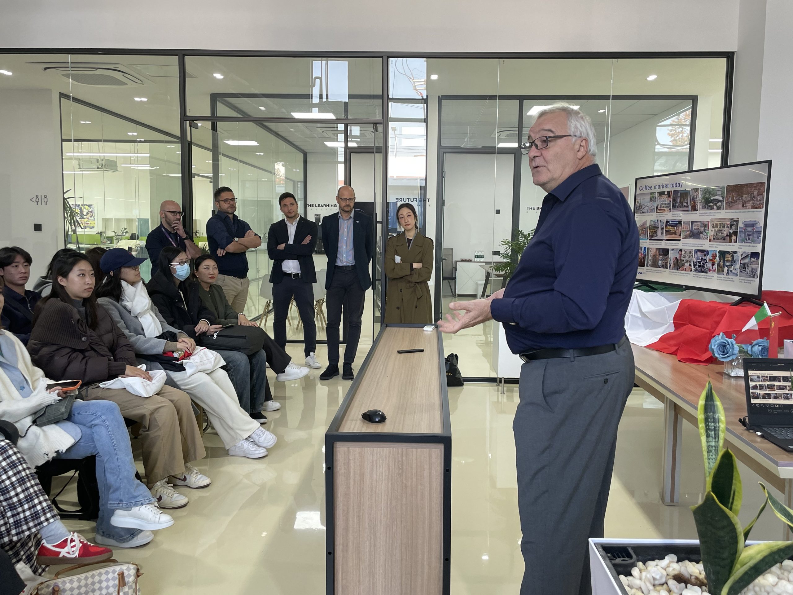 During the welcome session, Dr. Francesco Macheda and Dr. Esol Cho from the Department of International Studies shared the educational aims of connecting students with practice-oriented learning experiences, through the opportunities such as visits to leading international companies. Their remarks were followed by Andrea Pietrobon, General Manager of VEA Group and Lorenzo Bali, Board Director of the CICC, who warmly welcomed the IBGA students.