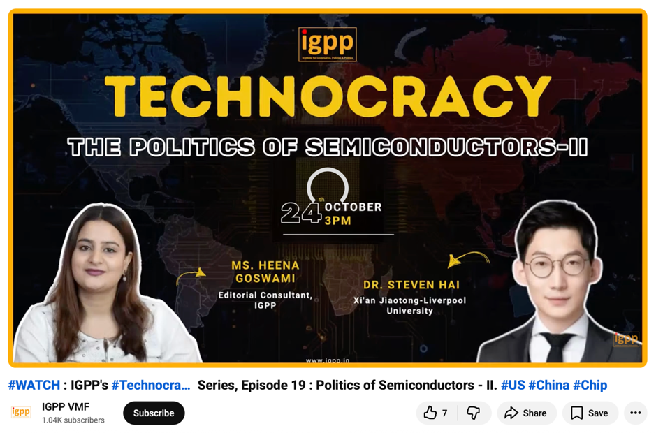 Summary: A recent episode of the Institute for Governance, Policies & Politics explored the geopolitical battle over semiconductor and AI chip manufacturing between the US, China, and India. Dr Jiawei (Steven) Hai, Assistant Professor at XJTLU’s Entrepreneurship and Enterprise Hub, shared his insights in the episode.