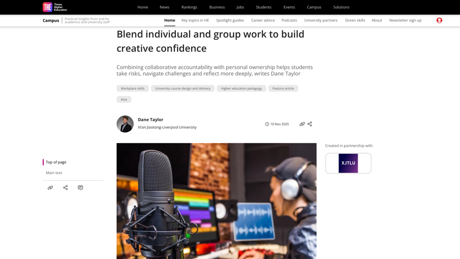 Summary: In a recent THE Campus article, Dane Taylor, Teaching Fellow at XJTLU’s Academy of Film and Creative Technology, shared a new teaching method that blends group and solo work and can boost confidence and risk-taking in students. It starts with collaborative tasks to build accountability, then shifts to individual projects using shared materials. This lets students explore ideas freely, see multiple valid outcomes, and grow their creative identity.