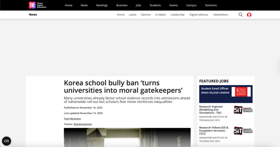 Headline: Korea school bully ban ‘turns universities into moral gatekeepers’