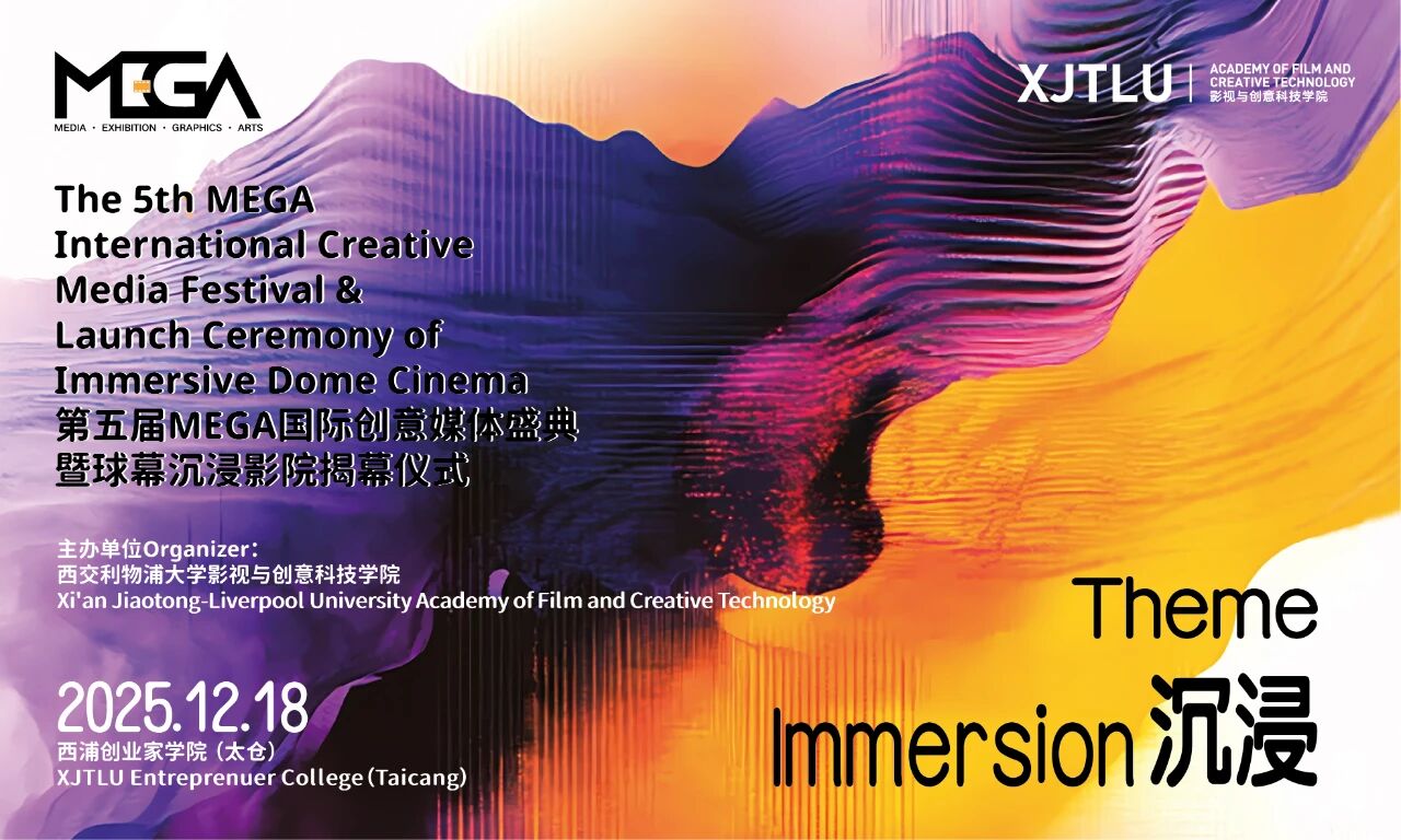 The Academy of Film and Creative Technology at Xi’an Jiaotong-Liverpool University (XJTLU) will host the 5th MEGA International Creative Media Festival on 18 December 2025 at the University’s Taicang campus. This year’s edition centres on the theme “Immersion”, exploring how immersive media is reshaping narrative expression, spatial experience and creative production. The festival also marks MEGA’s return to campus, taking place for the first time inside the Academy’s newly launched Immersive Dome Cinema.