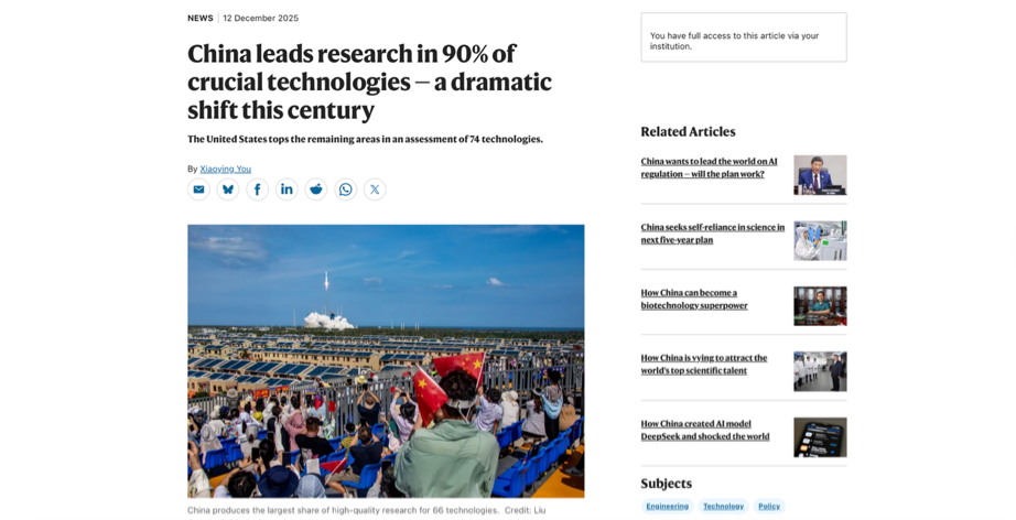 Headline: China leads research in 90% of crucial technologies — a dramatic shift this century