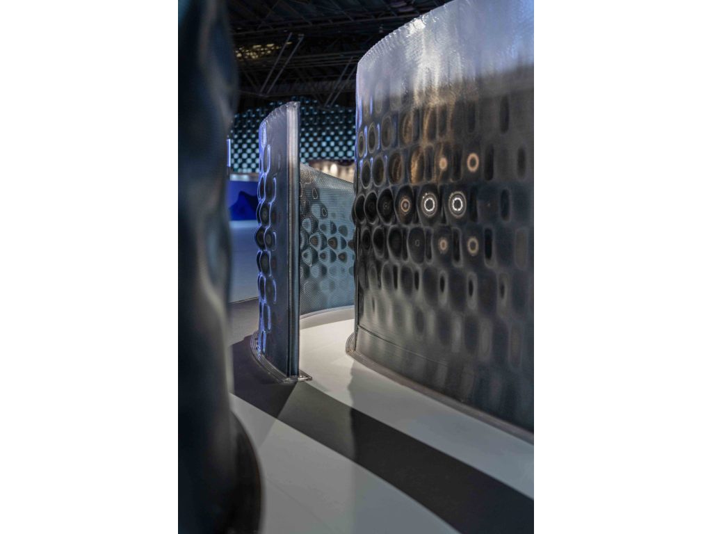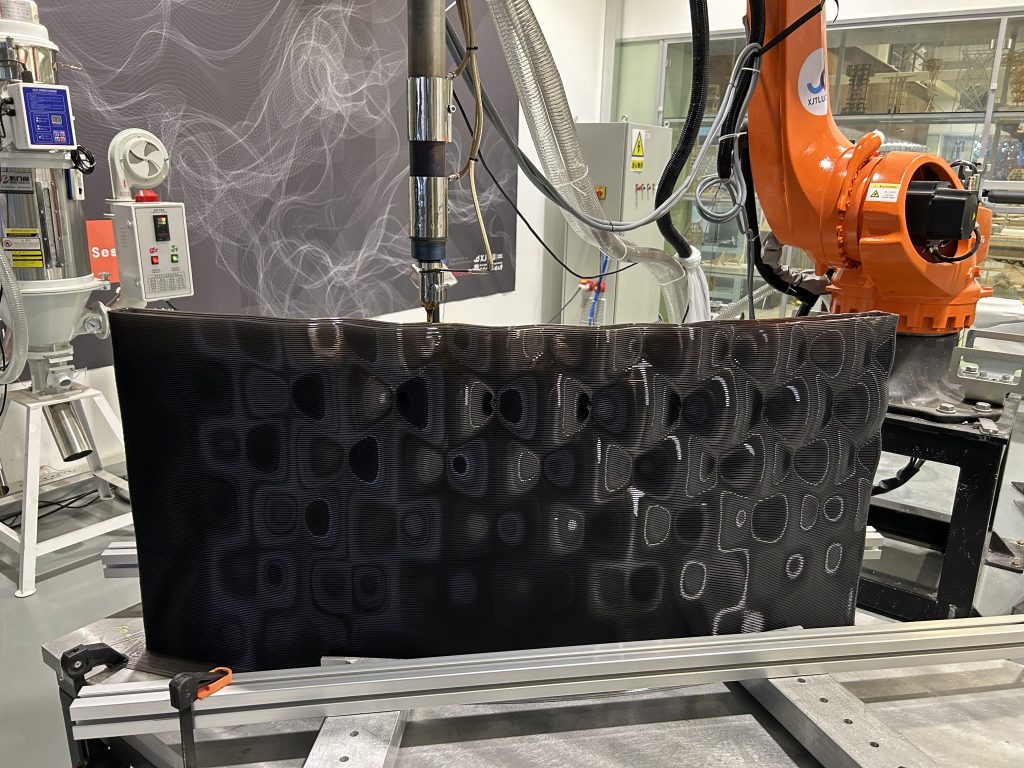 Robotic 3D printing plays a central role in realizing the project’s formal and experiential qualities. The technology enables precise control over complex geometries and surface textures, allowing the fluid expression of rippling forms that would be difficult to achieve through conventional fabrication methods. Digital design workflows ensure high levels of customization and adaptability, making the system suitable for different spatial contexts and scales while maintaining fabrication efficiency.