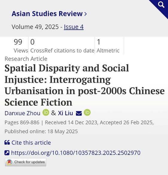 Dr Danxue Zhou, a 2025 graduate, authored and co-authored a prolific series of articles. Her work, appearing in SSCI-indexed journals like Asian Studies Review and CSSCI-ranked publications such as Wenxue Yanjiu, interrogates themes of urbanisation, social class, and gender in contemporary Chinese science fiction.