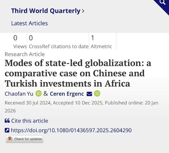 Yu Chaofan, a 2026 graduate, published two groundbreaking research articles in SSCI-indexed Third World Quarterly, analyzing US-China competition in Ethiopian industrial parks as a form of modern economic statecraft, as well we modes of state-led globalization.