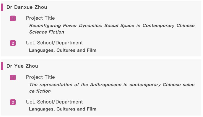 Dr Yue Zhou was selected for the prestigious Freiburg Rising Stars Academy (FRSA) 2025/26 fellowship in Germany and also received XJTLU’s HSS PhD Research Excellence Award in 2025. She has further been awarded a “Yangfan (Set Sail) Talents Program” fellowship by the Chinese National Research Center of Science Fiction.