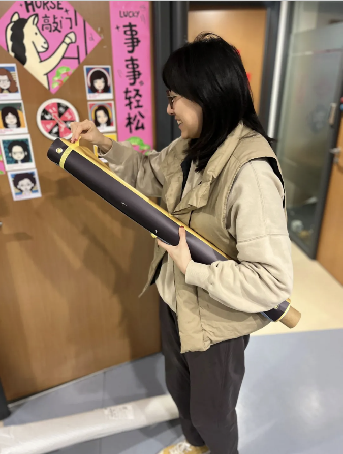 Wanyi Cheng, academic administrator of DMC, carefully opens the first batch of arriving exhibits in front her office, decorated for the Chinese New Year.