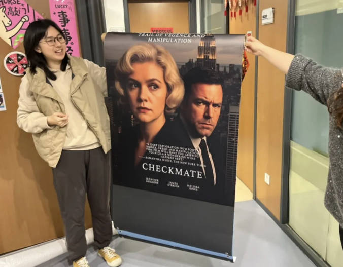 Wanyi Cheng displays and explains a fake movie poster to a School academic administrator passing by. Photo by Yanning Huang.