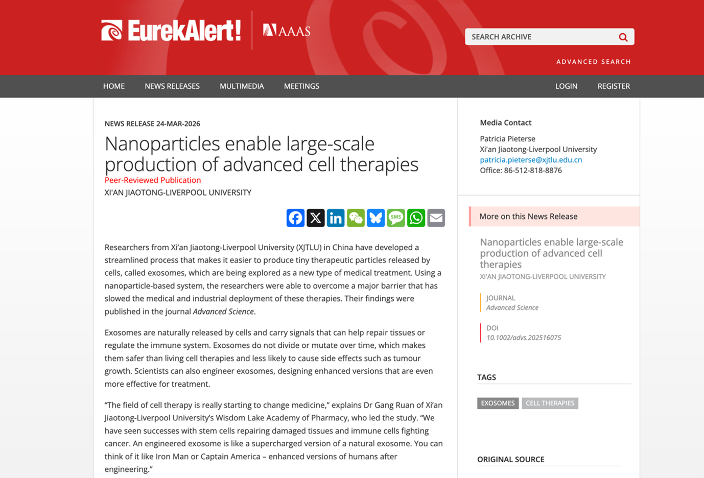 Summary: Researchers from XJTLU have developed a streamlined process that makes it easier to produce tiny therapeutic particles released by cells, called exosomes, which are being explored as a new type of medical treatment. Using a nanoparticle-based system, the researchers were able to overcome a major barrier that has slowed the medical and industrial deployment of these therapies. The study was led by Dr Gang Ruan at XJTLU Wisdom Lake Academy of Pharmacy.