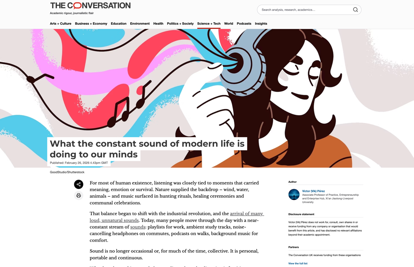 Summary: In his recent article, Dr Victor Pérez, Associate Professor at XJTLU’s Entrepreneurship and Enterprise Hub, shared that listening has shifted from occasional, shared experiences rooted in nature to a constant, personalised stream of sound. Today, people use music and audio to manage mood, focus and productivity, but this always-on soundscape can crowd out silence, reducing opportunities for reflection and subtly influencing how we think and cope.