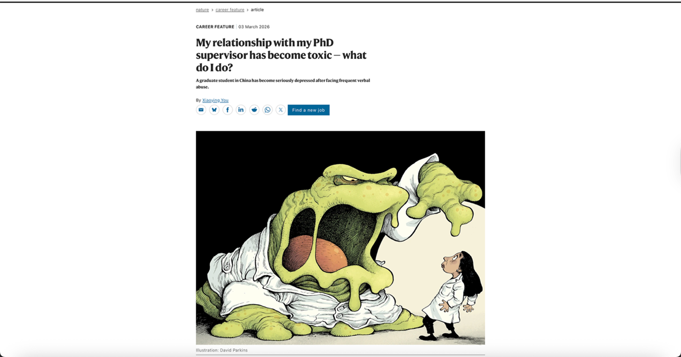Summary: A PhD student wrote to Nature Magazine, asking how to deal with a supervisor who provides little guidance while behaving abusively.