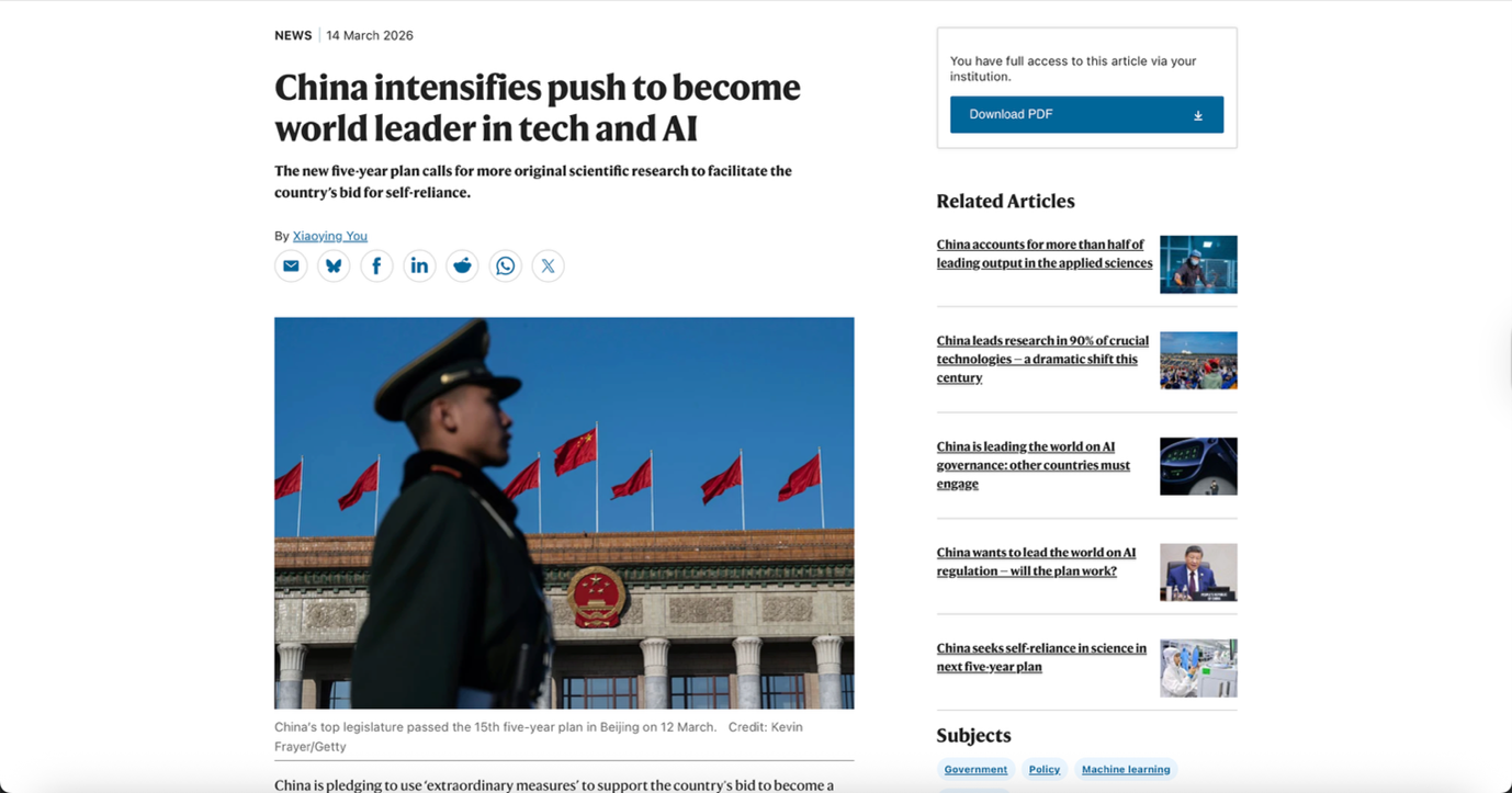 Summary: China has revealed its 15th five-year plan, pledging to use “extraordinary measures” to become a global leader in artificial intelligence, quantum technology, and other cutting-edge fields.