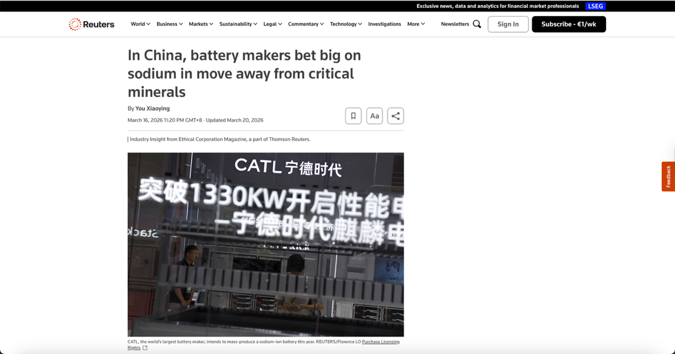 Headline: In China, battery makers bet big on sodium in move away from critical minerals
