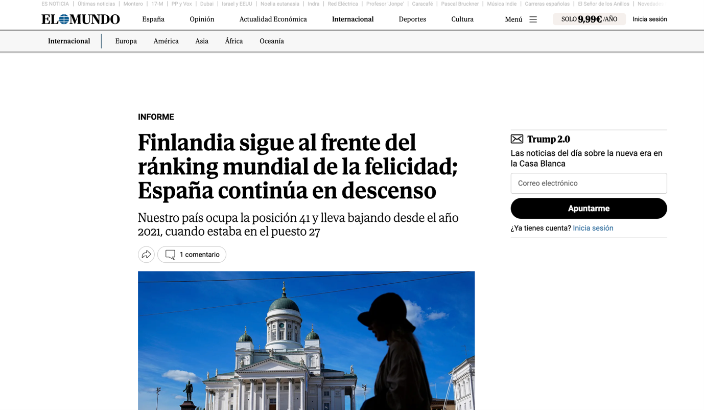 Headline: Finlandia sigue al frente del ránking mundial de la felicidad; España continúa en descenso (Finland remains at the top of the world happiness ranking; Spain continues its decline)