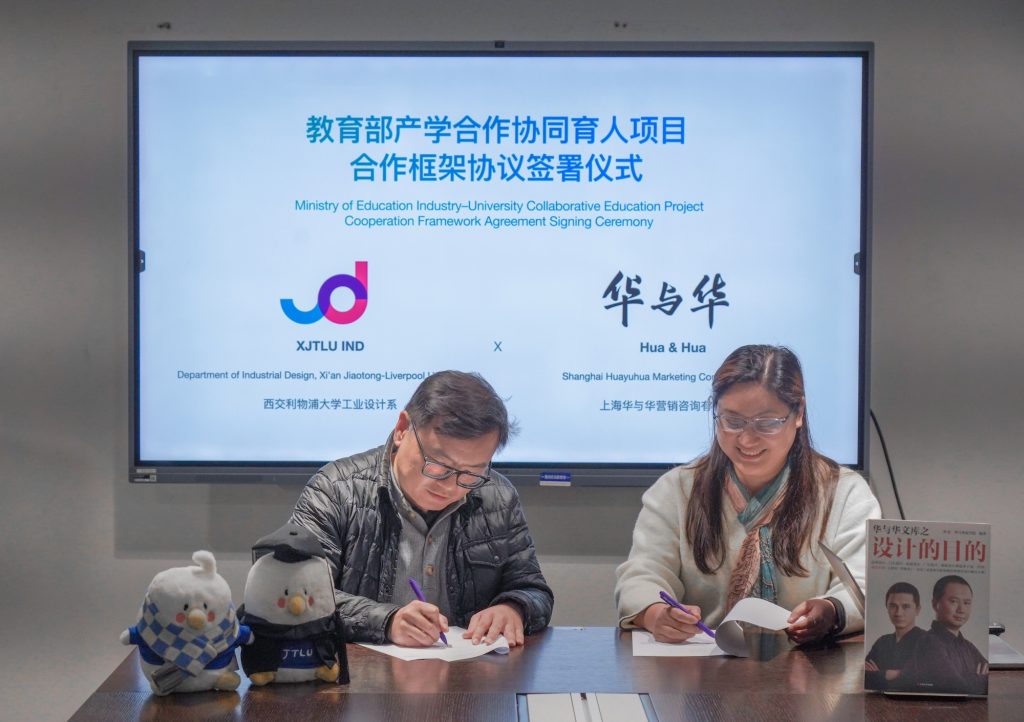 Dr Cheng-Hung Lo, Head of the Department of Industrial Design at XJTLU Design School, signs the course collaboration framework agreement with Mrs Xiaoyan Xia, President of Hua & Hua Business School