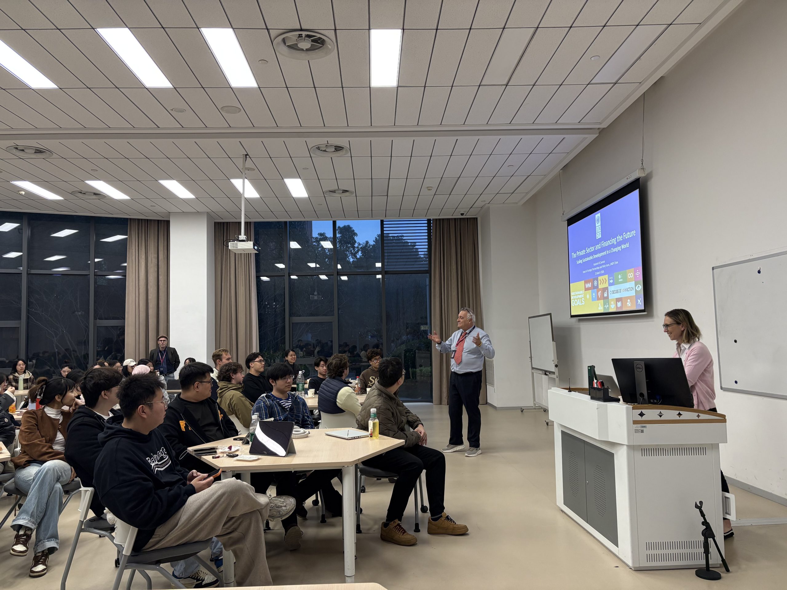 On 23 March 2026, the Department of International Studies welcomed Violante di Canossa, Head of Strategic Partnerships and Policy at the United Nations Development Programme (UNDP) China, for an engaging discussion on global development, sustainable finance, and career pathways in international organisations. The room was full, reflecting strong student interest in these timely topics.