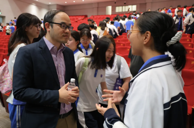 After the lecture, Dr Kuang engages with students, responding to their questions on artificial intelligence and digital media. Photo courtesy of Shenzhen Experimental School.