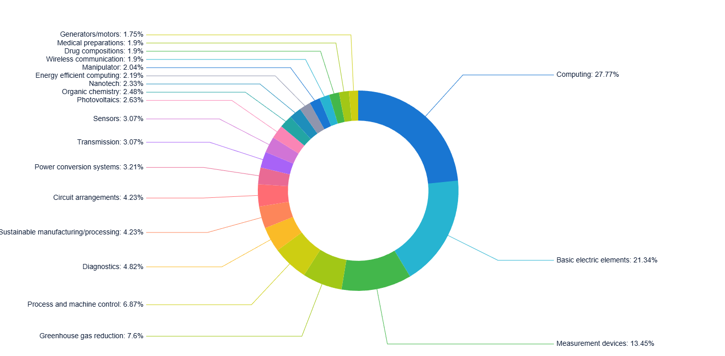 XJTLU’s patent applications are mainly for inventions, which account for 84% of the total number (see figure 1). These inventions are mainly for computation, basic electric elements, or measurement devices (figure 2).