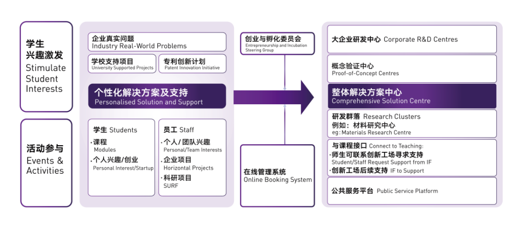 The Comprehensive Solution Centre of the Innovation Factory serves as a platform and clustered system centred on delivering comprehensive solutions to one or more key issues identified within specific industry contexts prioritised by the XJTLU Entrepreneur College (Taicang). Its business model is illustrated in the diagram. The establishment of such centres begins with industry environments and challenges that demonstrate long-term sustainability. As such, collaboration with industry partners is required to introduce authentic business scenarios or operational problems. For example, the Robotics Comprehensive Solution Centre collaborates with Haier Group to develop robotics-based solutions for the smart home sector. Focused on smart home environments, it seeks to address the challenge of intelligent household integration by developing smart home robots.