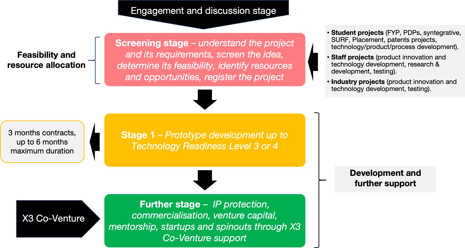 - If project team decide on progression to further support stages, such as commercialisation, IP protection, business development plan creation and investment attraction. Soft handover to X3 Co-Venture for further support in collaboration with Innovation Factory.