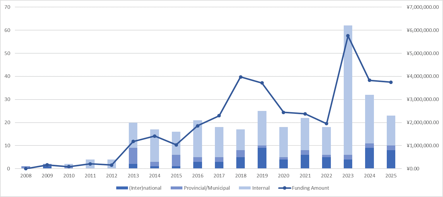 Since 2018, IBSS academic staff have received 9 International-level grants, 33 National-level grants, 14 Provincial and Municipal-level and 153 University-level grants. A full breakdown of the projects awarded funding over the past 8 years (2018-2025) can be found in the tables below: