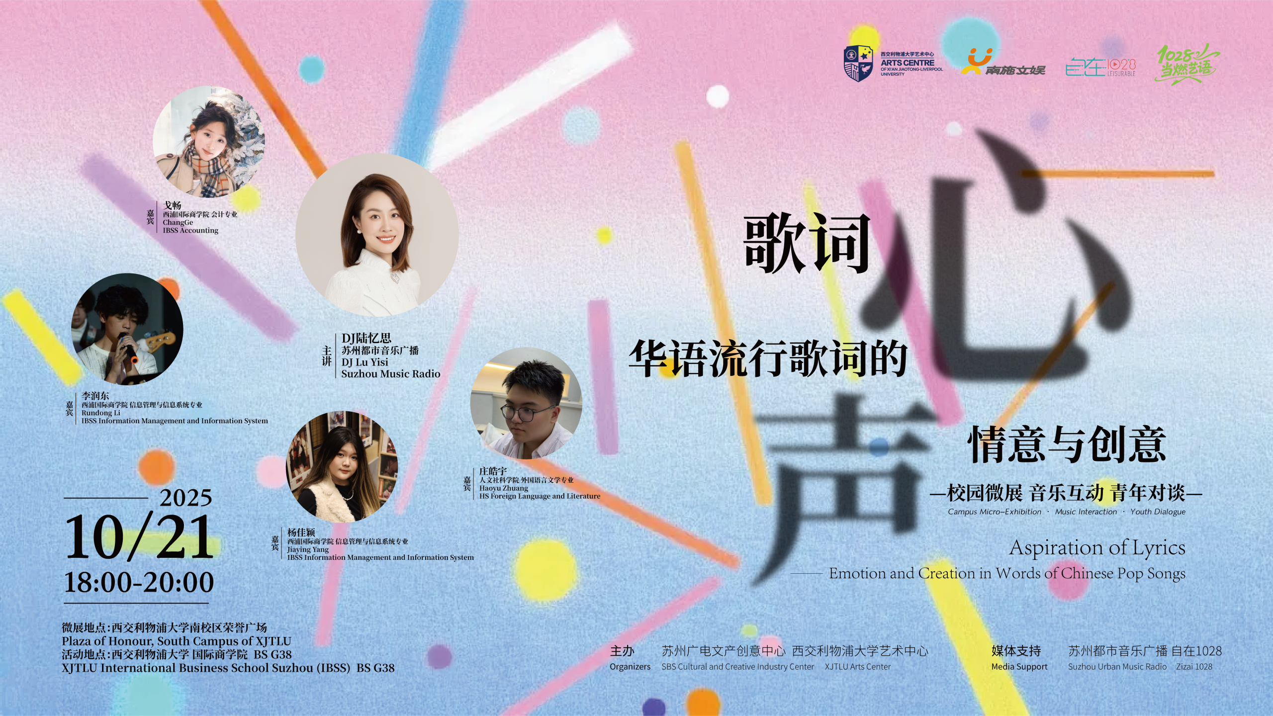 华语流行音乐,不仅是旋律的艺术,更是文字与情绪的结晶。那些经典的流行歌词是成为一代人的情感容器与集体记忆,它会潜移默化地形塑我们的情感状态,也会成为策展创意的发想源头。本次分享,将潜入华语流行歌词的深海,进行一场关于“情意”与“创意”的探索,并联合西浦的“好声音们”带来一场小型的秋夜唱谈会。