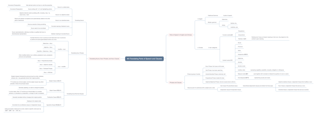 不同的课程各有侧重。我们习得翻译理论与实践的严谨与细微,回溯前人成果并加以创新性运用;我们对不同体裁的文本细致分析,欣赏字句表面的审美也挖掘其背后的意蕴,从而进行有批判性的甚而颠覆式的重组与思考。除了保持思考,也应多多总结。我喜欢用思维导图规整每一周的新知,用以理顺脉络,更能包容遐思。