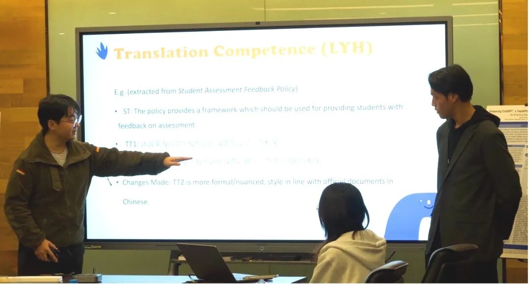 第二组对大语言模型进行了研究。同学们选取《surf教职员指南》作为翻译材料,向ChatGPT提供了三种不同级别的提词,探索提词质量如何影响ChatGPT的翻译结果。通过比较分析BLUE指标(比较翻译质量评价指标)的评估数据,该组同学发现,当翻译人员提供的提示词越细节、情境性越强,ChatGPT的翻译结果也更加精确具体、更加符合文本语境。文学与翻译系的项目指导老师对学生们的研究成果给予了充分肯定。他们指出,在这个科技与翻译行业深度融合的时代,翻译学子在这个实践项目中有效测试了大语言模型的翻译能力。