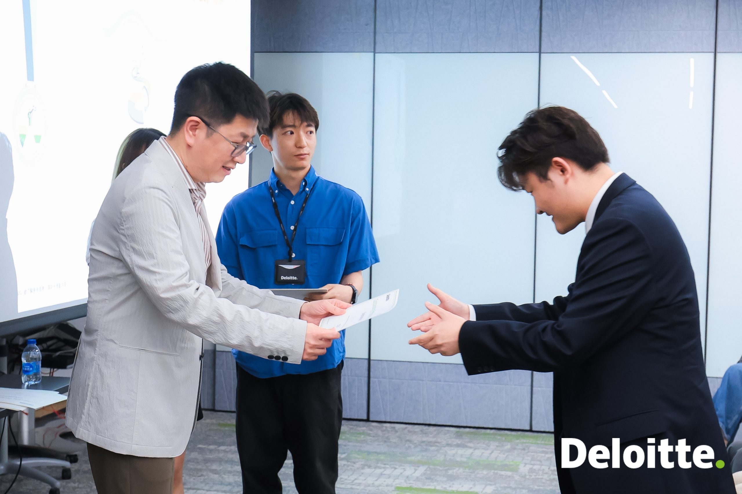 德勤中国审计及鉴证华东区增长领导人、德勤中国房地产与运输行业审计与鉴证业务主管合伙人、公募基础设施REITS业务主管合伙人倪敏先生与德勤中国审计及鉴证华东区主管合伙人林弘先生为获得Offer的同学颁奖。