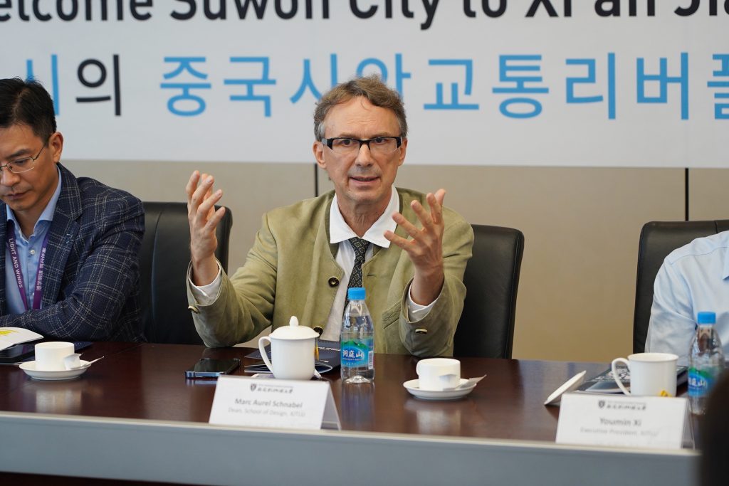 西浦设计学院院长Marc Aurel Schnabel教授(下图)指出,学院在建筑与城市设计、设计思维、可持续性与宜居性等领域拥有丰富经验,能够将研究与实践紧密结合,学院期待与水原市在科研、教育及实践项目方面展开深入合作,共同探索可持续与宜居的未来城市形态。