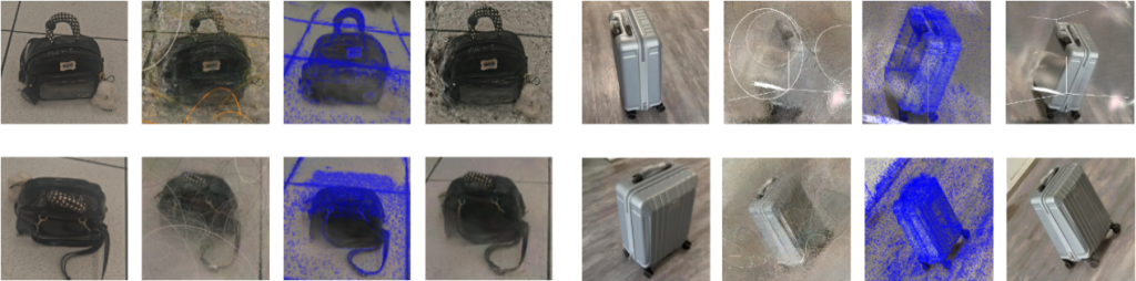 他们选择了轮廓更清晰的的背包、行李箱等物品,取得了出色的成果。从对比图中可以看出,原本稀疏、不规则的初始点云,经过算法7000次、30000次的迭代优化后,变得愈发密集和规整,最终渲染出的三维图像与真实物体高度接近。