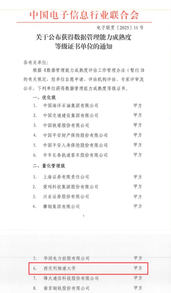 近日,西交利物浦大学(以下简称“西浦”)顺利通过中国电子信息行业联合会组织的数据管理能力成熟度DCMM四级认证,标志着西浦数据管理能力达到“量化管理级”水平。在2022年,西浦成为中国首家申请并通过DCMM三级认证的高校,对标四级标准,经过三年扎实的工作推进和实施,西浦在数据管理工作方面取得了又一个阶段性成果。