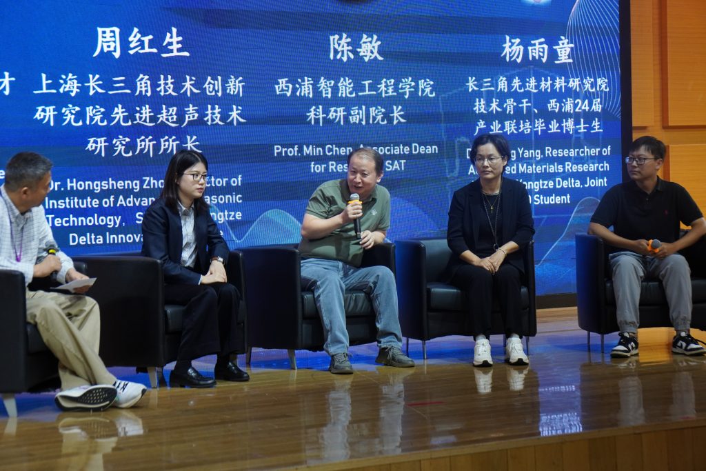随后由西浦-集萃学院执行院长徐树公教授主持的圆桌论坛中,产学研各方代表分享了宝贵见解。长三角先进超声技术研究所所长周红生指出,联合培养的学生为研究所注入了新活力,并在解决技术问题、预研关键技术方面作用显著。西浦智能工程学院陈敏教授分享了校企长期合作中“信任建立”与“成果共享”的重要性。作为联培成果的优秀代表,西浦2024届博士毕业生及新晋产业导师杨雨童以亲身经历,印证了联合培养模式对科研与个人职业发展的价值。最后,长三角国创中心副主任樊陆欢讲述了联合培养模式提供的真实、高质量、多元化的产业资源,为同学们的就业以及个人未来探索提供了一定的保障。
