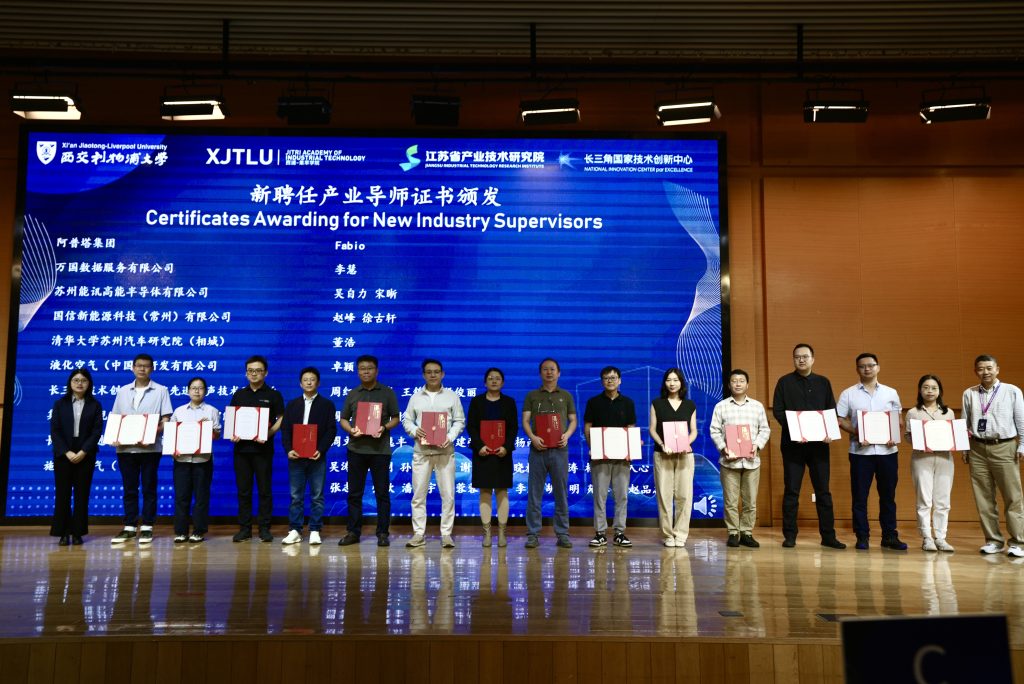 活动现场还举行了新聘产业导师证书颁发仪式。来自阿普塔集团、万国数据服务有限公司、施耐德电气(中国)、液化空气(中国)研发有限公司、清华大学苏州汽车研究院等单位的十余位产业导师代表接受聘书,正式成为西浦-集萃学院的产业导师。