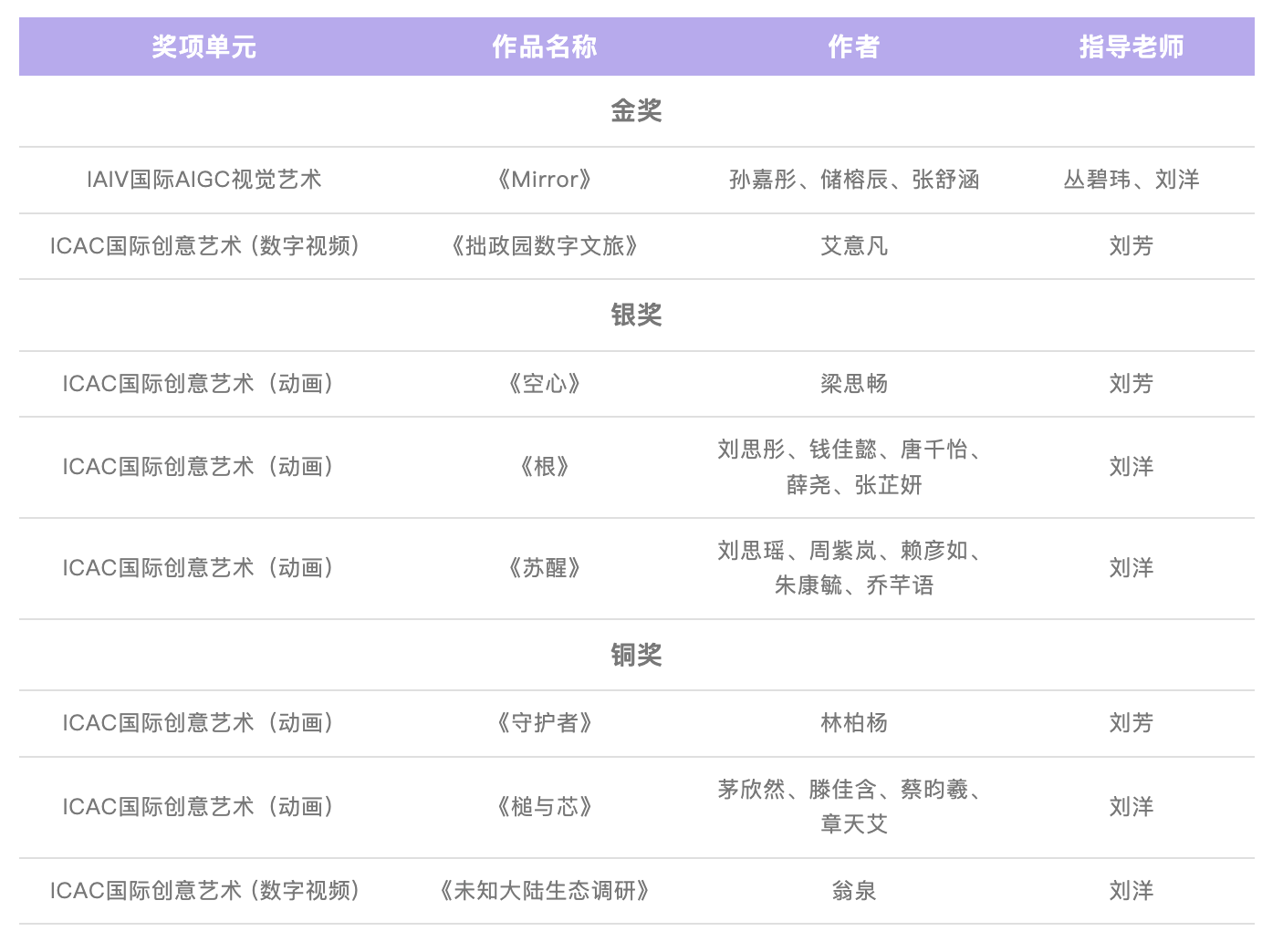 本届艺术节中,西浦影视与创意科技学院多件作品入围并获奖,涵盖 AIGC 视觉艺术、数字视频、动画等多个赛道。主要奖项包括:
