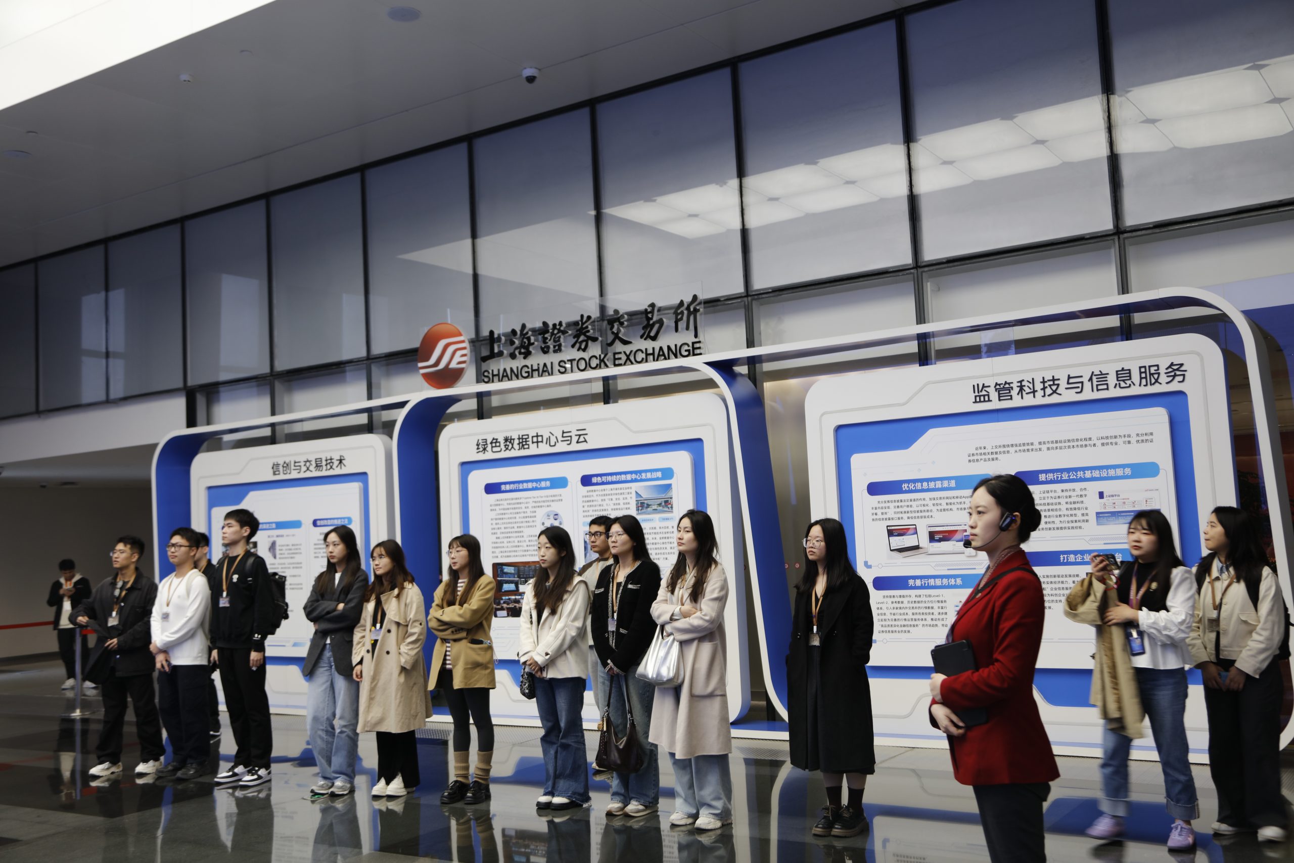 在参访过程中,同学们跟随讲解依次参观了上交所投教基地核心区域,近距离了解主板、科创板等市场板块的运行概况。从虹口区浦江饭店的早期交易场地,到陆家嘴上海证券大厦的现代化交易大厅,再到如今互联互通的上海金融交易广场,学子们通过珍贵的历史照片、实物展品和互动装置,系统回顾了上交所从 1990 年获批成立以来的发展历程。学生们见证无数企业上市的纪念锣、记录 30 年奋进历程的红色小球装置等展品,也直观感受了中国资本市场从萌芽到壮大的艰辛与辉煌。