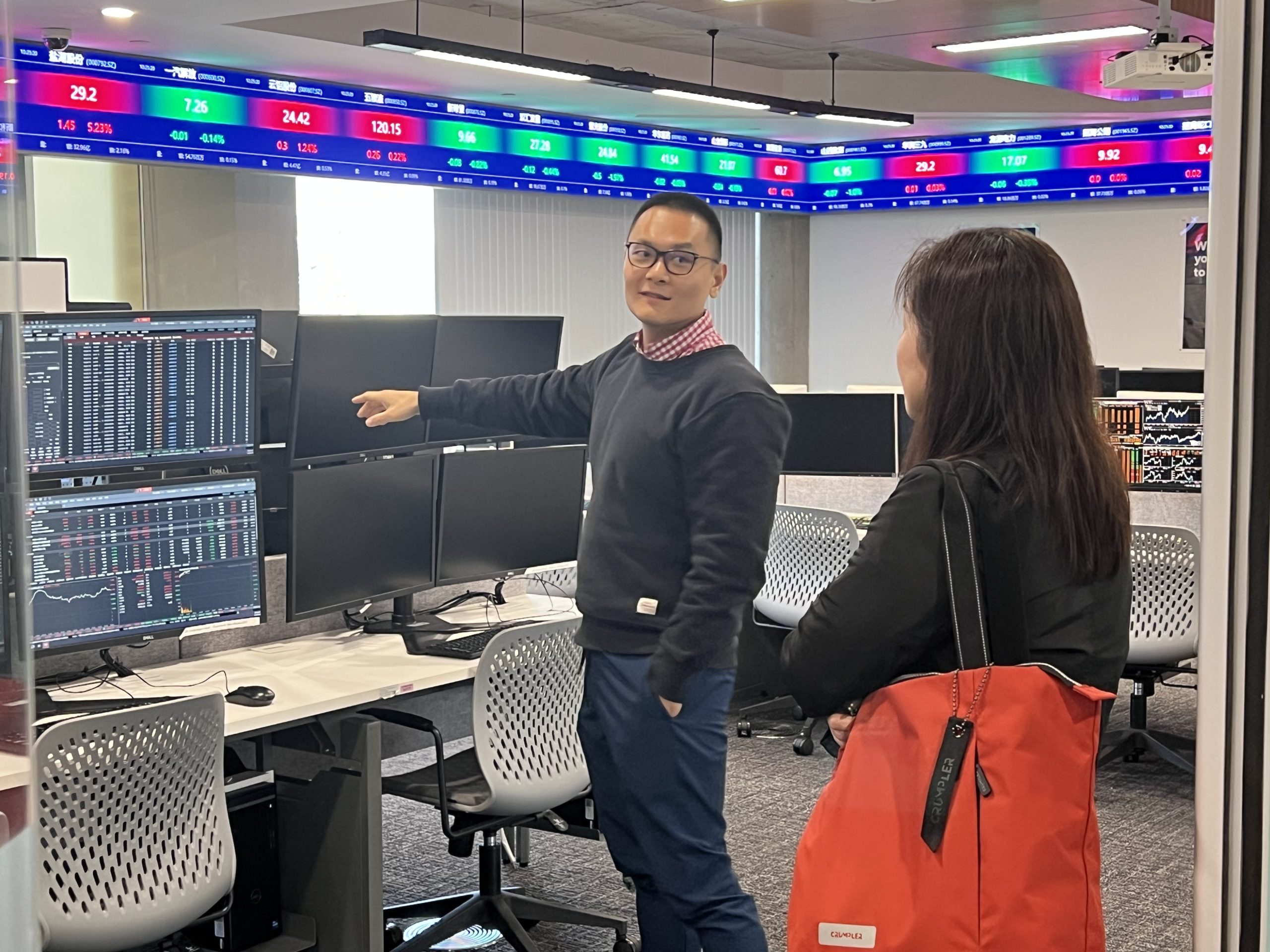 在参观环节中,刘嘉涛博士向哈工程代表团详细介绍了金融交易大厅的设施功能、运行机制以及在教学与科研中所发挥的平台作用,展示了IBSS在实验室建设方面所遵循的国际化标准与取得的阶段性成果。