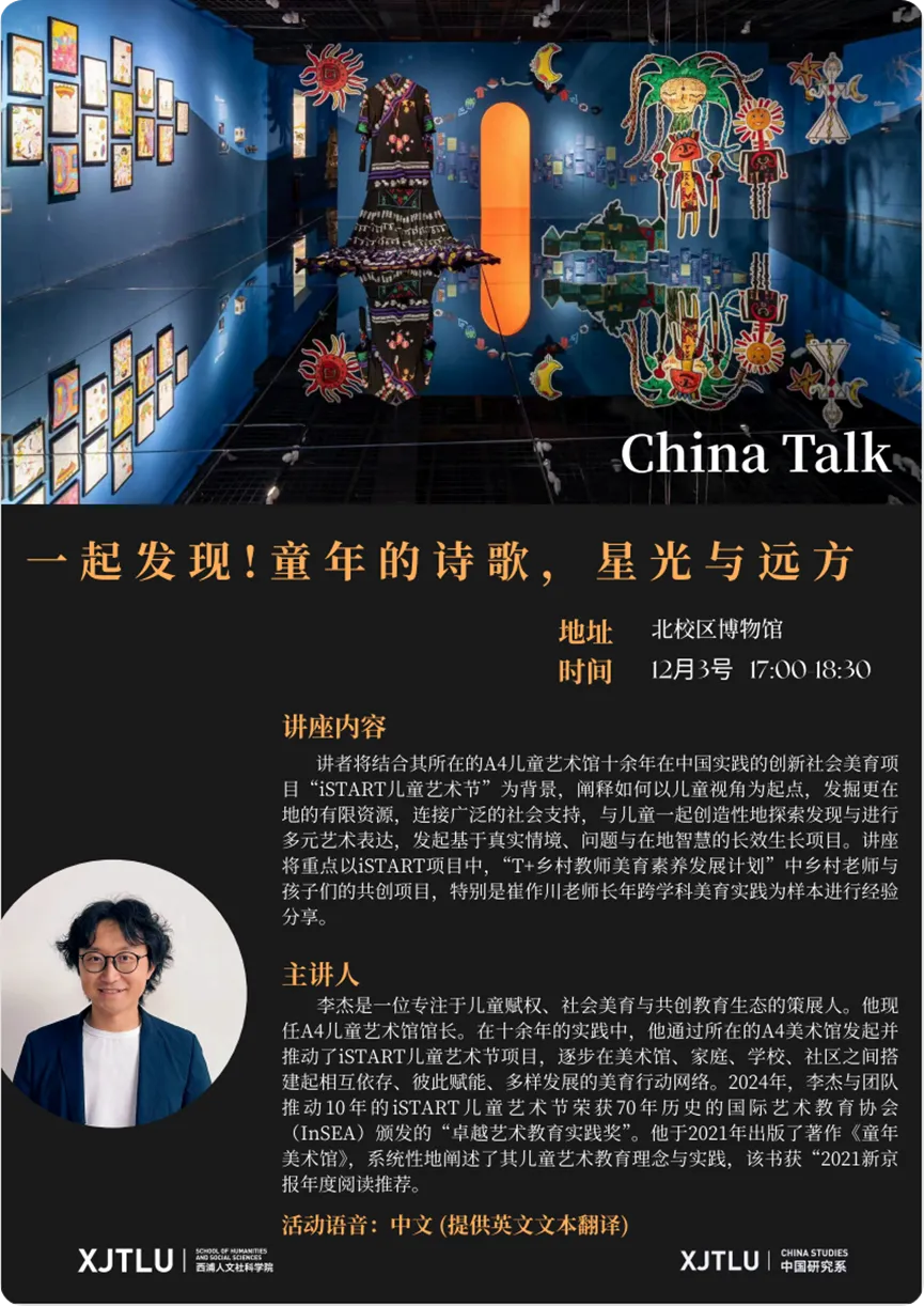 除了本次儿童诗歌展以外,12月3日将举办的China Talk讲座还会邀请到A4美术馆的馆长李杰,他将基于本次诗歌展与西浦师生们分享他实践的社会创新项目“iSTART儿童艺术节”。欢迎大家届时到现场聆听。