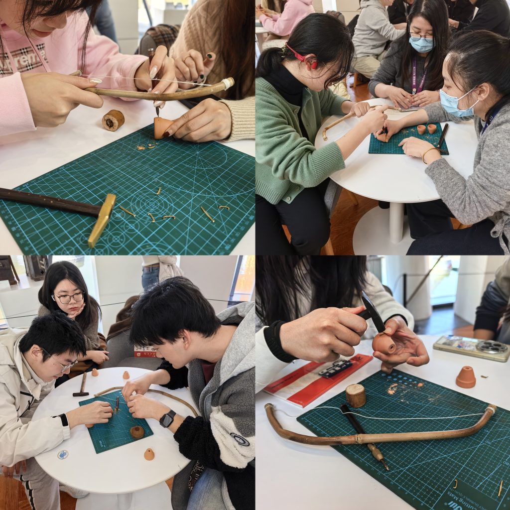 随后的实践环节将活动推向高潮。在祝峰老师的指导下,同学们分组上手,体验锔瓷的核心步骤——钻眼上钉。大家学习使用金刚钻在陶罐上打孔并镶嵌小巧的铜钉,当陶瓷与铜钉在手中紧密结合时,同学们不仅感受到了“慢工出细活”的匠心真谛,更直观体会到“残缺”如何焕发出全新的生命光彩。同学们在专注操作中领悟到,锔瓷不仅是技艺的传承,更是一种对不完美的尊重与升华,是对“惜物”精神的当代诠释。在最后的互动环节,同学们踊跃提问,与祝峰老师展开了深入交流。问题涉及锔瓷技艺的技巧、现代设计理念的融入、年轻一代如何接触并爱上传统手艺等。祝老师强调,锔瓷的核心精神在于“尊重物与人之间的情感联结”,它在提倡可持续生活方式的今天,具有格外重要的当代价值。他鼓励同学们不仅作为非遗手工艺的体验者、传承者,更能成为传统美学在生活中的传播者。