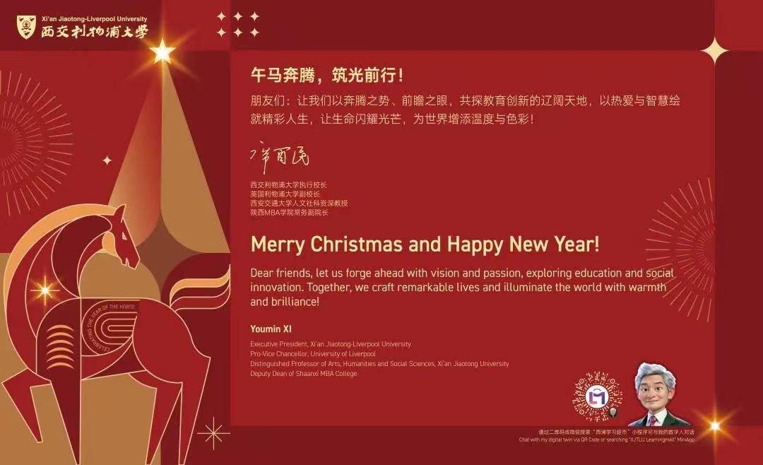 前路依旧江海浩荡,波涛汹涌,航标依稀。让我们携手前行,以前瞻的视野和引领的勇气、以融贯东西的智慧、科技与人文谐振的力量、人机共生共创的能力,以及内在的定力与持续的创新,继续循光而行,不为迷雾所困,不为未知所阻。在迷雾中保持清醒,在变动中坚守初心,在困惑时生发创造,在征途中收获成长。再次感谢所有西浦人的贡献和朋友们的陪伴,满怀期待昂首挺进2026。