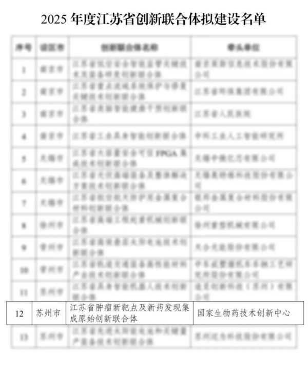 “江苏省肿瘤新靶点及新药发现集成原始创新联合体”由国家生物药技术创新中心(以下简称 “国创中心”)牵头,联合苏州亚盛药业有限公司、西交利物浦大学、苏州大学、苏州大学附属第一医院等单位共同组建,涵盖生物医药领域国家级平台、龙头企业、重点高校、三甲医院及科技金融机构,形成肿瘤新靶点发现、新药研发、临床转化及产业化的全链条创新集群,破解国内肿瘤创新药靶点“卡脖子”难题,助力江苏打造全球生物医药研发与制造高地。