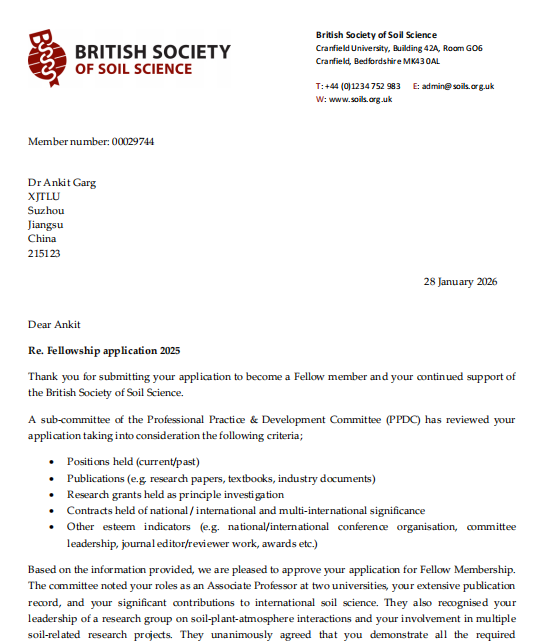 西交利物浦大学理学院健康与环境科学系副教授 Ankit Garg博士近日获得英国土壤科学学会会士称号。该称号旨在肯定Garg博士在土壤科学领域的科研与教学贡献,以及其在生物岩土工程、绿色基础设施与可持续地质环境工程等方向的学术影响力。会士资格由学会专业实践与发展委员会正式批准。今年学会在全球范围内仅遴选9位研究人员晋升会士,其中 Garg博士是目前任职机构位于中国的唯一入选者;其余8位分别任职于美国、英国、澳大利亚和加拿大的相关机构。