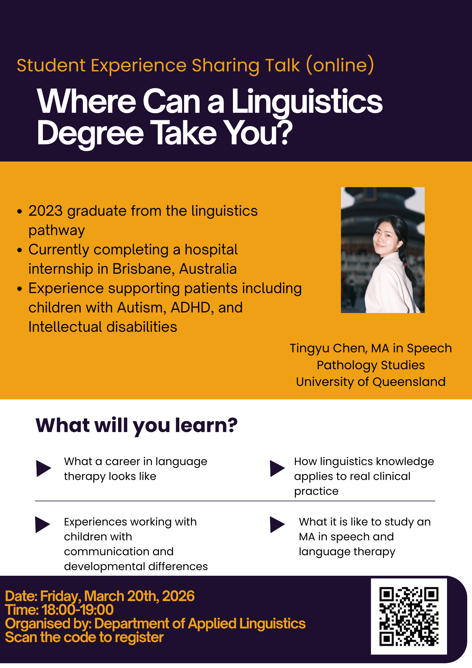 本次讲座是应用语言学系职业论坛讲座系列的第一场,旨在邀请校友和行业从业者分享真实经历,帮助在校生和未来学生了解语言学学位的多元发展路径。